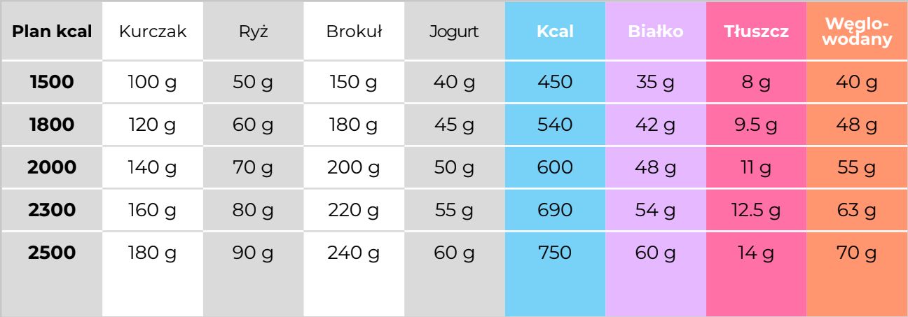 Porcja dania ma około 450 kcal (plan 1500 kcal). Potrzebujecie innej kaloryczności? Spójrz na tabele niżej — tu dzieje się magia.