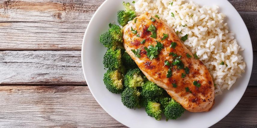 Kurczaka zamarynuj w jogurcie i przyprawach, podsmaż i podpiecz. Podawaj z ugotowanym ryżem i brokułami na parze.