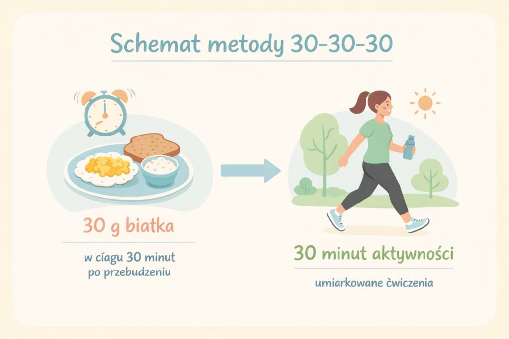 Metoda 30-30-30 to nie dieta, lecz poranna rutyna, która opiera się na trzech prostych krokach wykonywanych każdego ranka: zjedzeniu 30 gramów białka w ciągu 30 minut po przebudzeniu, następnie 30 minutach ćwiczeń o niskiej intensywności (np. spacerze z tętnem 135 uderzeń na minutę (BPM).