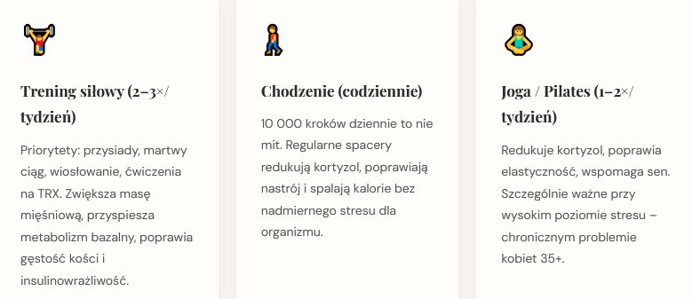 Cardio 5 razy w tygodniu to nie Twoja odpowiedź. Dla kobiet po 35. trening siłowy jest ważniejszy niż trening aerobowy. Dlaczego? Bo buduje i chroni masę mięśniową, co bezpośrednio wpływa na metabolizm.