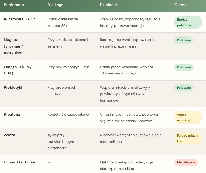 Rynek suplementów jest pełen produktów „na odchudzanie”, z których większość nie działa. Poniżej lista tego, co ma realne poparcie naukowe dla kobiet w Twojej grupie wiekowej.