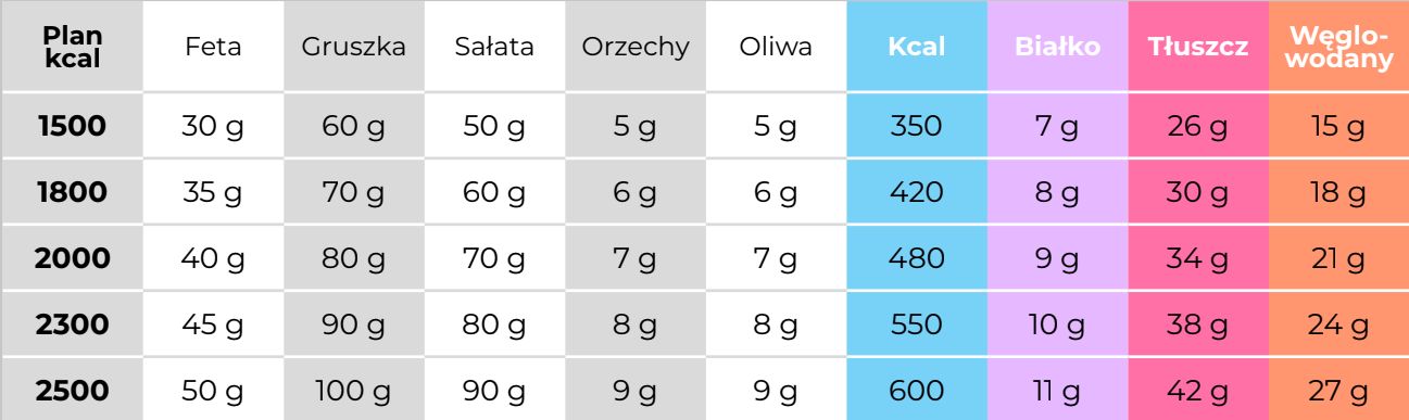 Składniki bazowe: (~350 kcal / plan 1500 kcal). Masz ochotę na bardziej syty posiłek? Nic prostszego — spójrz w tabelę, znajdź odpowiedni poziom kaloryczności i zwiększ porcje zgodnie z jasnymi wskazówkami. Bez skomplikowanego liczenia i zbędnego kombinowania!