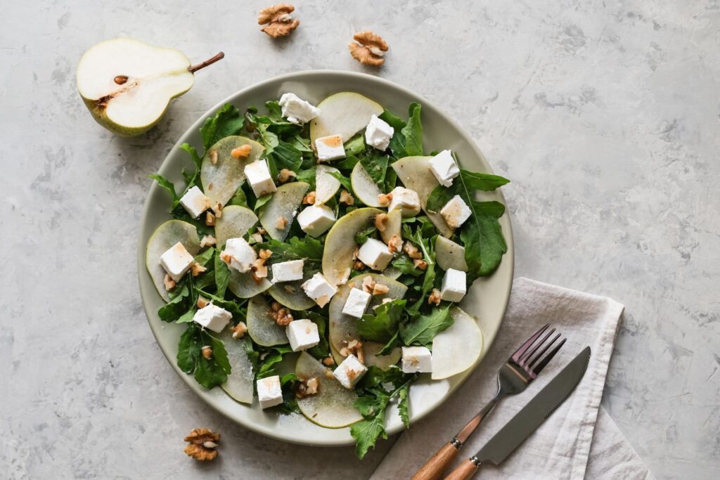 Sałatka z fetą, gruszką i orzechami włoskimi. Efektowna kolacja dla znajomych (i nie tylko)