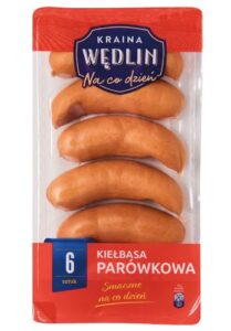 Drugim produktem, którego bym nie zjadł i wam nie polecam, jest Kiełbasa parówkowa Kraina Wędlin. To jeden z tych wyrobów, które bardzo często pojawiają się w koszykach – czy to na szybki obiad, czy na grilla. Na pierwszy rzut oka wygląda zwyczajnie: kiełbasa jak kiełbasa. Ale kiedy przyjrzymy się bliżej, widać, dlaczego to kiepski wybór.