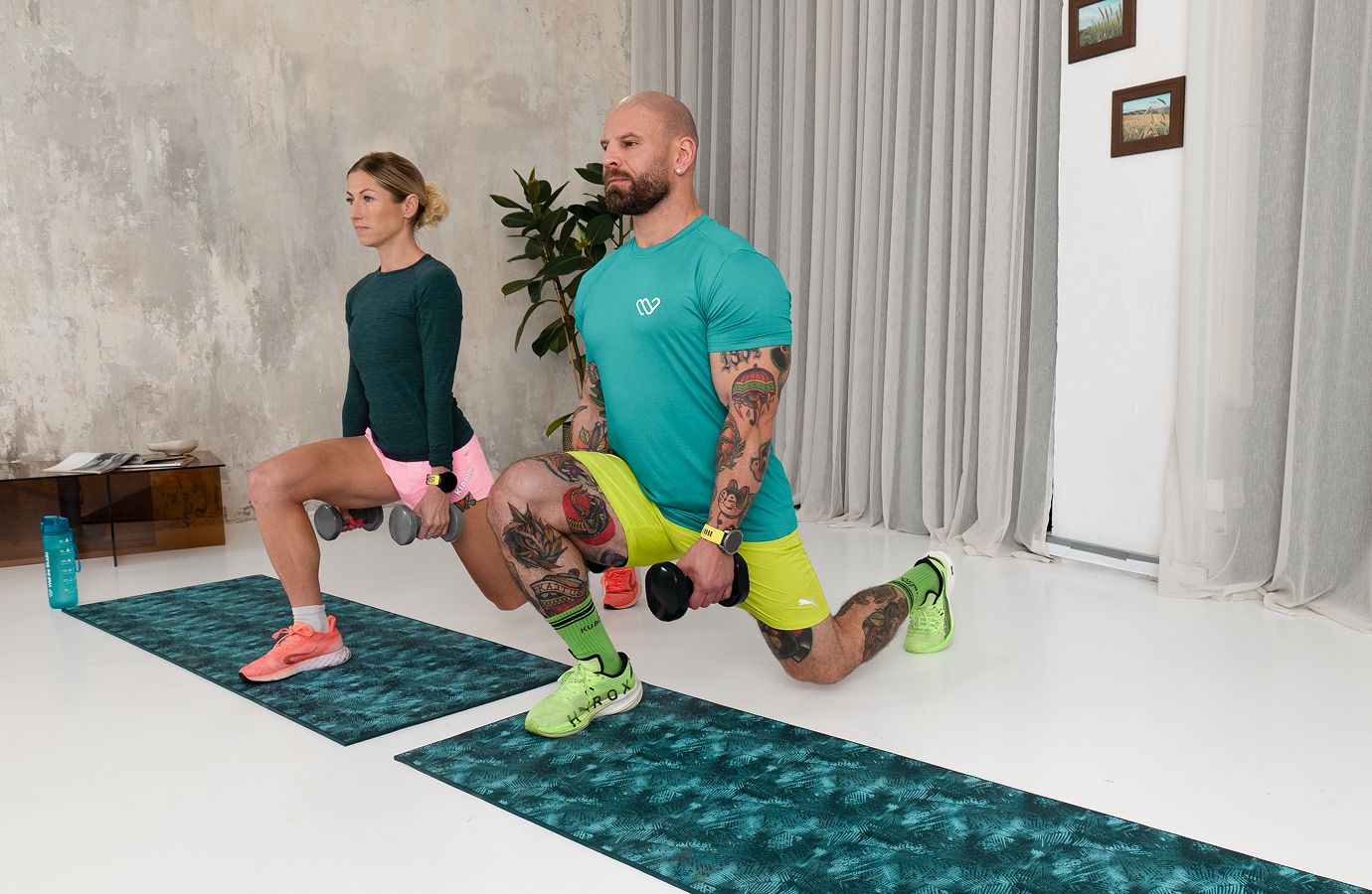 Trening obejmuje 10 ćwiczeń z hantlami, które stopniowo podkręcają pracę mięśni, ale nie przytłaczają skomplikowanymi ruchami. To klasyczny, domowy trening siłowy w wersji smart: ruchy są proste, techniczne i tak dobrane, żeby robić robotę od pierwszych minut.