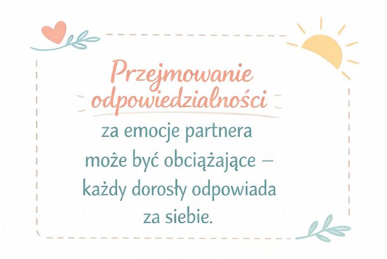 Taka dynamika może być bardzo wyczerpująca. Z czasem pojawia się poczucie, że musisz stale pilnować emocjonalnej równowagi w relacji. Tymczasem każdy dorosły człowiek jest odpowiedzialny za swoje emocje. Wsparcie partnera jest ważne, ale nie powinno oznaczać przejmowania kontroli nad jego samopoczuciem.