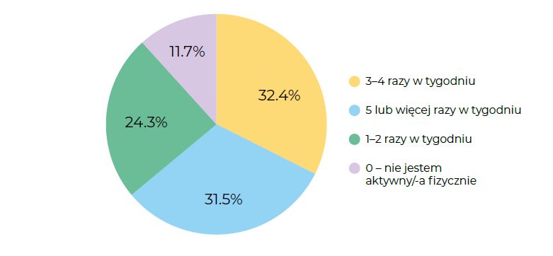 Zdecydowana większość respondentów podejmuje aktywność fizyczną regularnie, choć jej intensywność jest różna. I tak 3–4 razy w tygodniu ćwiczy 32,4% osób, a 5 lub więcej razy w tygodniu – 31,5. Oznacza to, że ponad 60% badanych to osoby systematycznie dbające o ruch.