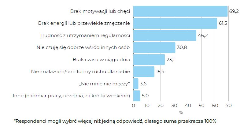 Dane pokazują, że główne bariery mają charakter psychiczny i emocjonalny, a nie logistyczny — dominują problemy z motywacją, zmęczeniem i organizacją.