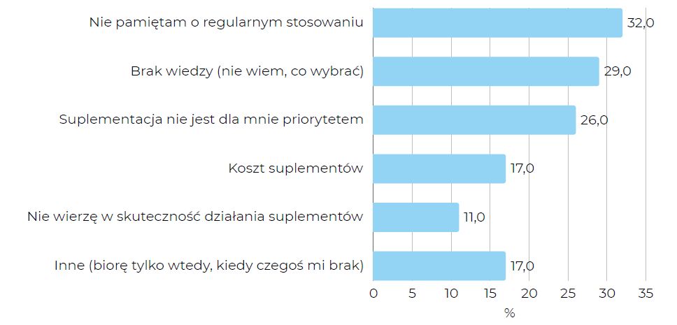 Do głównych barier suplementacji należą: brak regularności (32%), brak wiedzy, co wybrać (29%) i niskie priorytet (26%). To sygnał, że wiele osób ma dobre intencje, ale nieprzekute w rutynę – problemem jest nie tyle brak środków, co brak systematyczności i zaufania do skuteczności preparatów.