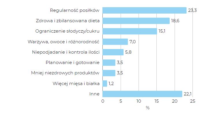 Pozostałe odpowiedzi – jak większa ilość warzyw i owoców (7%), kontrola ilości jedzenia (5,8%) czy planowanie i gotowanie (3,5%) – mają mniejsze znaczenie, ale tworzą obraz dążenia do większej samodyscypliny i świadomości w codziennych wyborach. Bardzo niski odsetek wskazań na „więcej mięsa i białka” (1,2%) może świadczyć o rosnącym zainteresowaniu dietami roślinnymi lub ograniczaniem mięsa.