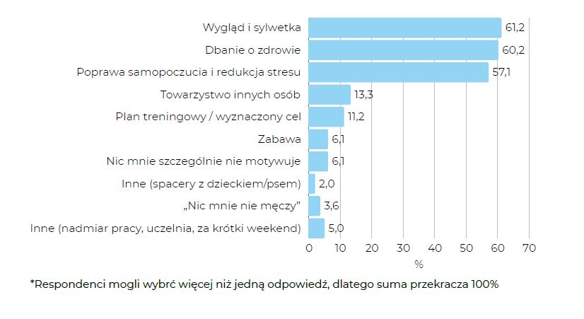Znacznie rzadziej kieruje nami towarzystwo innych osób (13,3%) czy konkretny plan treningowy (11,2%), a już zupełnie rzadko – czysta zabawa (6,1%). Dla wielu osób aktywność nie jest więc spontaniczną przyjemnością, lecz raczej formą „obowiązku wobec siebie” lub narzędziem do osiągnięcia celu.
