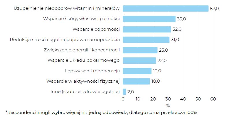 Najczęstszym celem suplementacji jest uzupełnienie niedoborów witamin i minerałów (57%), a dalej wsparcie skóry, włosów i paznokci (37%) oraz odporności (35%). Widać więc, że suplementacja ma przede wszystkim charakter profilaktyczny i estetyczny, a nie stricte wydolnościowy.