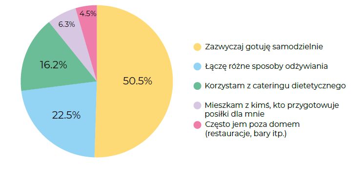 Jaki preferujemy styl odżywiania? Ponad połowa badanych (50,5%) gotuje samodzielnie, co sugeruje rosnącą świadomość w zakresie jakości posiłków i kontroli nad dietą. Spora część (22,5%) łączy różne sposoby odżywiania – to elastyczne podejście, typowe dla osób prowadzących intensywny tryb życia. Tylko 4,5% korzysta z cateringu dietetycznego, a 6,3% często je poza domem, co może wynikać zarówno z ograniczeń czasowych, jak i preferencji kulinarnych.