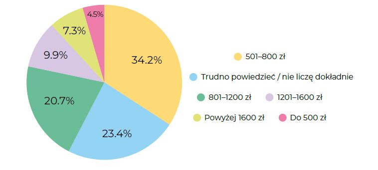 Najwięcej osób (34,2%) wydaje miesięcznie na jedzenie od 801 do 1200 zł, a 23,4% – 1200–1600 zł. To pokazuje, że większość respondentów stawia na umiarkowany budżet, jednak prawie 10% nie potrafi dokładnie określić swoich wydatków, co może sugerować brak świadomego monitorowania kosztów żywienia.