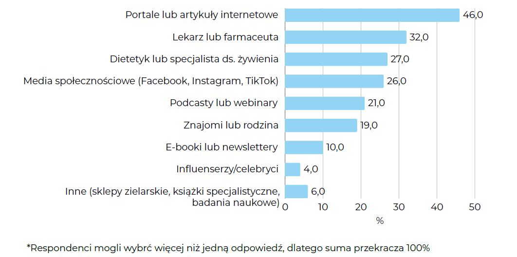 Najczęściej wskazywanym źródłem informacji są portale i artykuły internetowe (46%), co potwierdza cyfryzację wiedzy o zdrowiu. Na kolejnych miejscach znalazły się lekarz lub farmaceuta (32%) oraz dietetyk (27%), co świadczy o tym, że choć specjaliści są ważni, internet wciąż pełni pierwszoplanową rolę edukacyjną. Media społecznościowe (26%) i podcasty (21%) zyskują na znaczeniu, co sugeruje trend poszukiwania treści w formach lekkich i dostępnych.