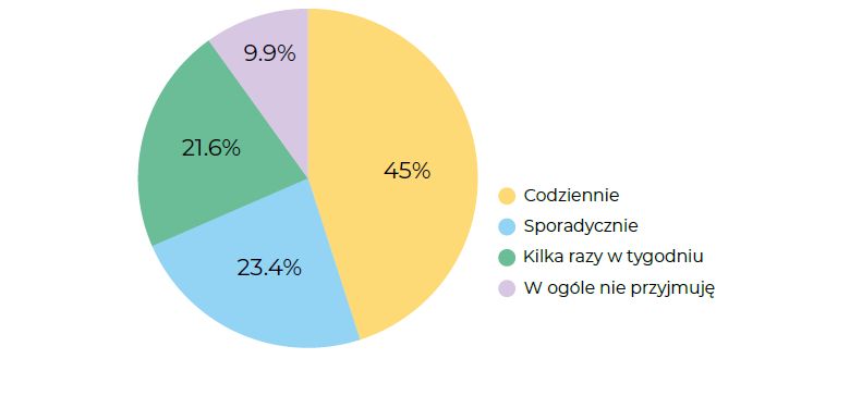 Suplementy diety przyjmuje regularnie spora grupa – 45% robi to codziennie, a 23,4% sporadycznie. Jednocześnie 21,6% w ogóle po nie nie sięga, co może wynikać z braku potrzeby lub przekonania o wystarczająco zbilansowanej diecie.